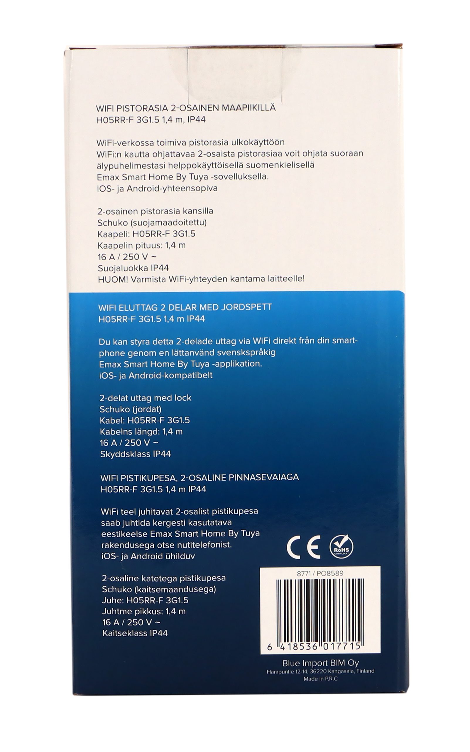 Älypistorasiat ovat suojattu kansilla ja on IP44-suojattu, joten se käy ulkokäyttöön hyvin. Varustettu 1,4 metriä pitkällä H05RR-F3G1.5-kaapelilla. Suojamaadoitettu.