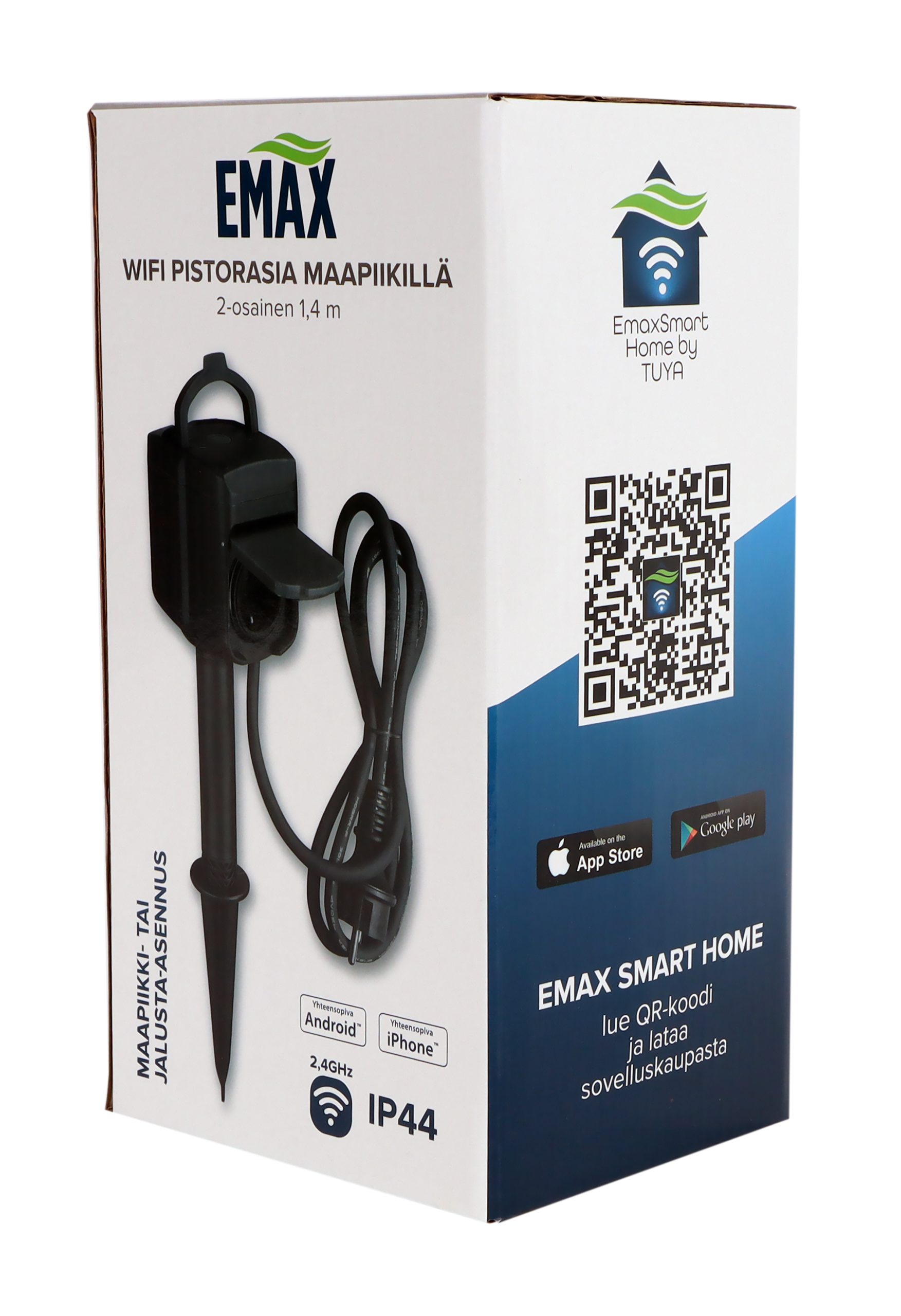 2-osainen WiFi pistorasia älykkäällä puhelinohjauksella. Tätä pistorasiaa voit komentaa suoraan älypuhelimestasi helppokäyttöisellä Emax Smart Home -mobiilisovelluksella.